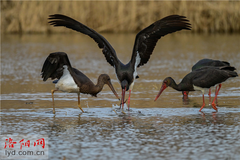 في العشرين من كانون الأول (ديسمبر) ، تبحث طيور اللقلق السوداء عن الطعام وتلعب في الأراضي الرطبة في نهر مينججين الأصفر.