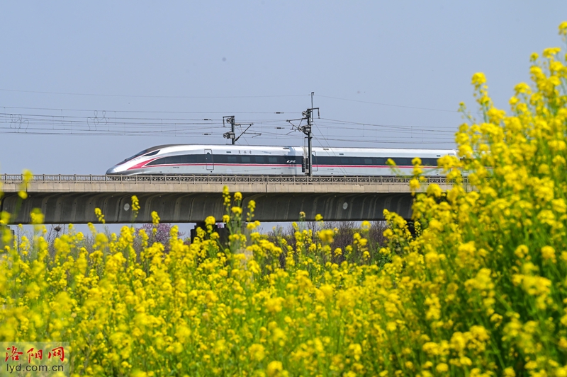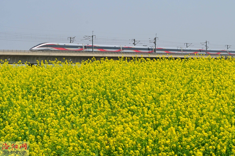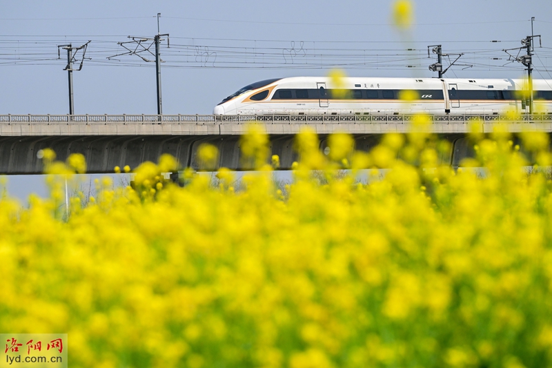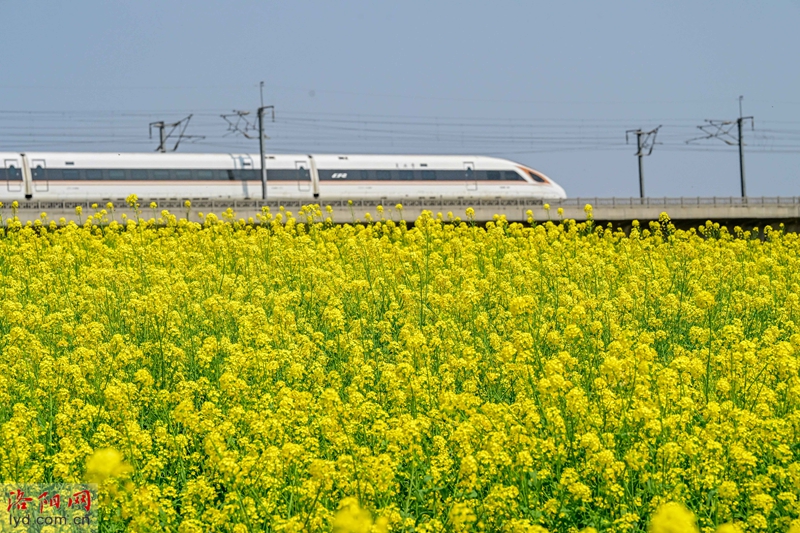 في 28 مارس ، تتفتح أزهار الاغتصاب بالقرب من متنزه Ganquan River Wetland في منطقة Luolong ، مما يشكل مشهدًا ربيعيًا حيويًا مع القطارات المارة في مكان قريب.