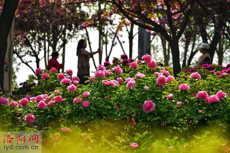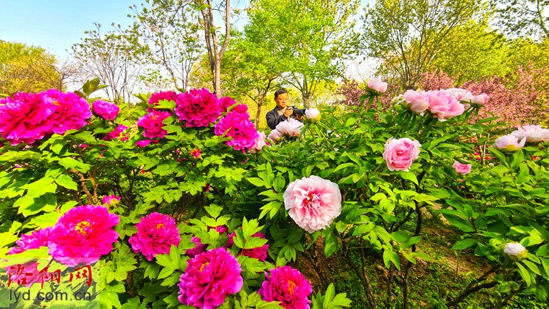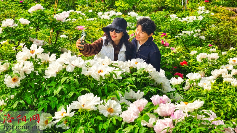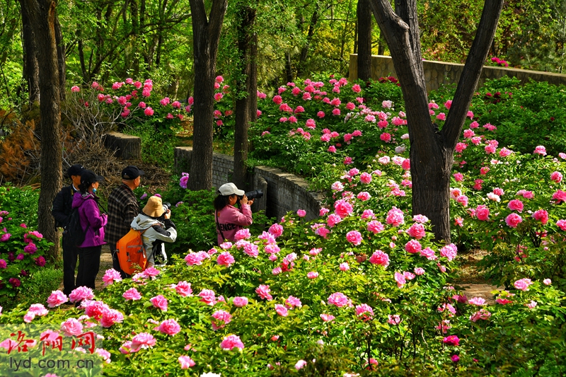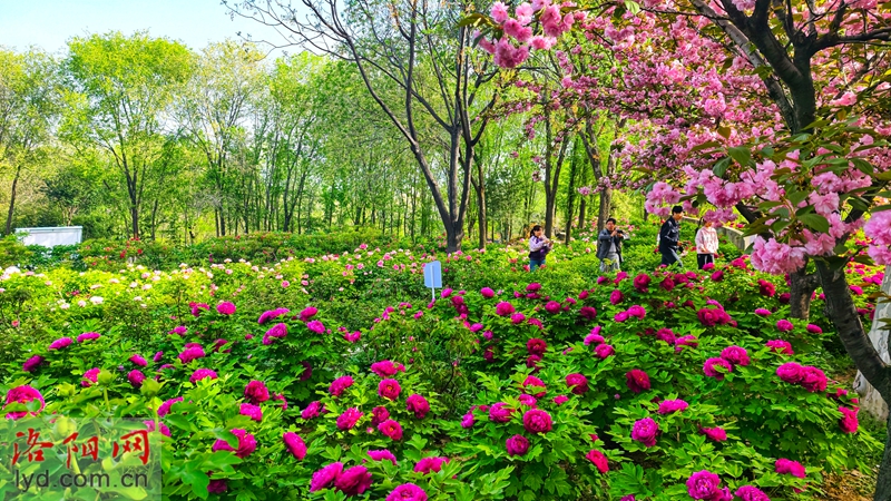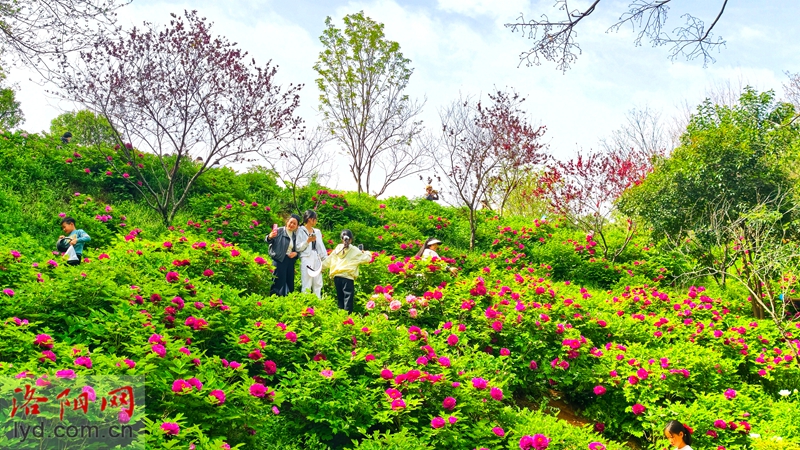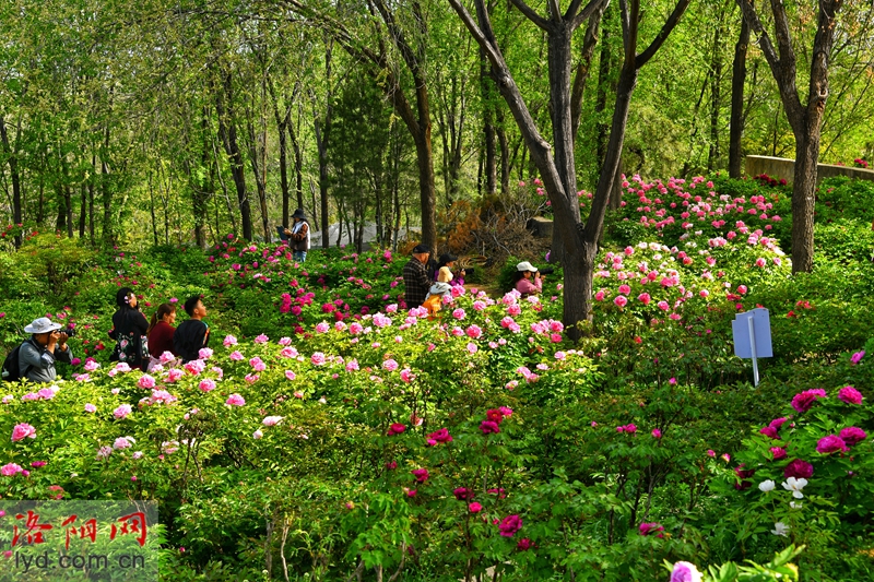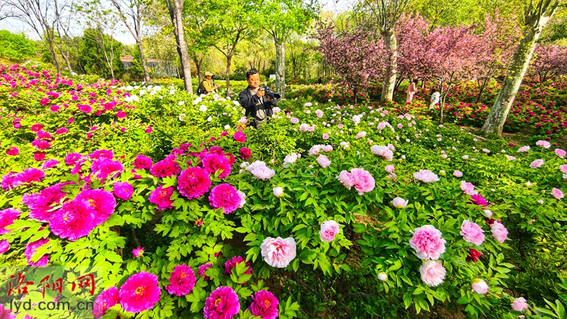 On April 5th, various types of peonies were blooming in the forest of Longmen Peony Garden, attracting tourists to visit and enjoy the flowers, experiencing their national beauty and fragrance.