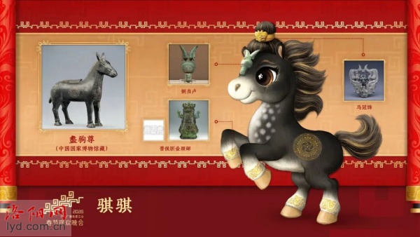 Kürzlich veröffentlichte die China Media Group das Bild des Maskottchens für die Frühlingsfest-Gala 2026. Vier Pferde namens „Qi Qi“, „Ji Ji“, „Chi Chi“ und „Cheng Cheng“ gaben ihr offizielles Debüt. Die von „Qi Qi“ getragene Kopfbedeckung „Danglu“ ist von einem in Luoyang ausgegrabenen Kupferdamloup aus der westlichen Zhou-Dynastie inspiriert.
