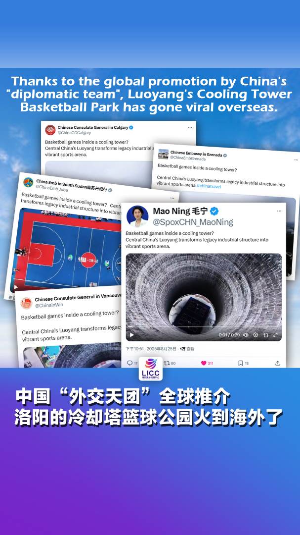 Location: Yangguangli Sun·Lab, Luoyang, China Here, when the 90-meter-high cooling tower is transformed into the most dynamic basketball court, it has attracted global promotion by China’s “diplomatic team”: Luoyang, China has turned its former industrial base into a vibrant sports arena.?:中国洛阳阳光里sun·lab。洛阳90米高的冷却塔变身最燃篮球场,引来“外交天团”全球推介:中国洛阳将工业遗产改造成活力四射的体育竞技场!#国际化洛阳连接中 #洛阳国际传播中心 #LICC 点击关注@洛阳国际传播中心 2025-08-27